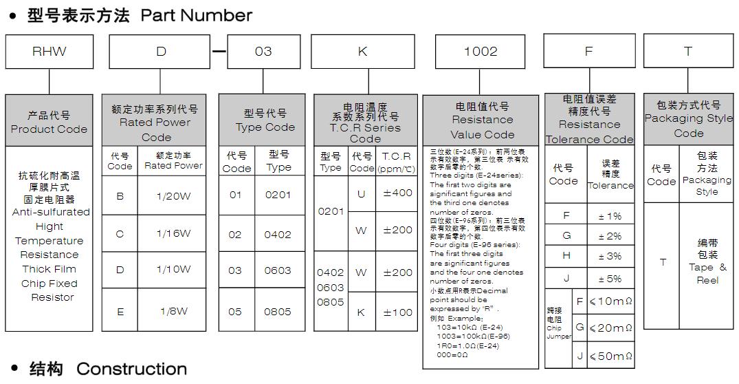 风华高科抗硫化耐高温厚膜片式固定电阻器型号命名规则: