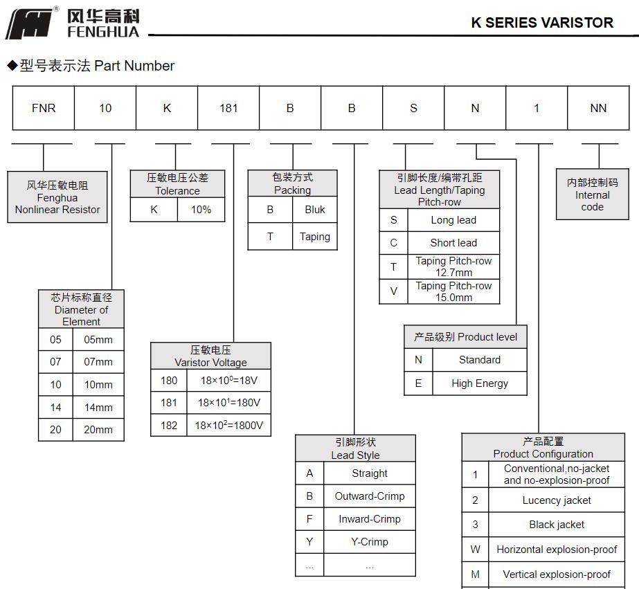 风华高科K系列压敏电阻器型号命名规则: