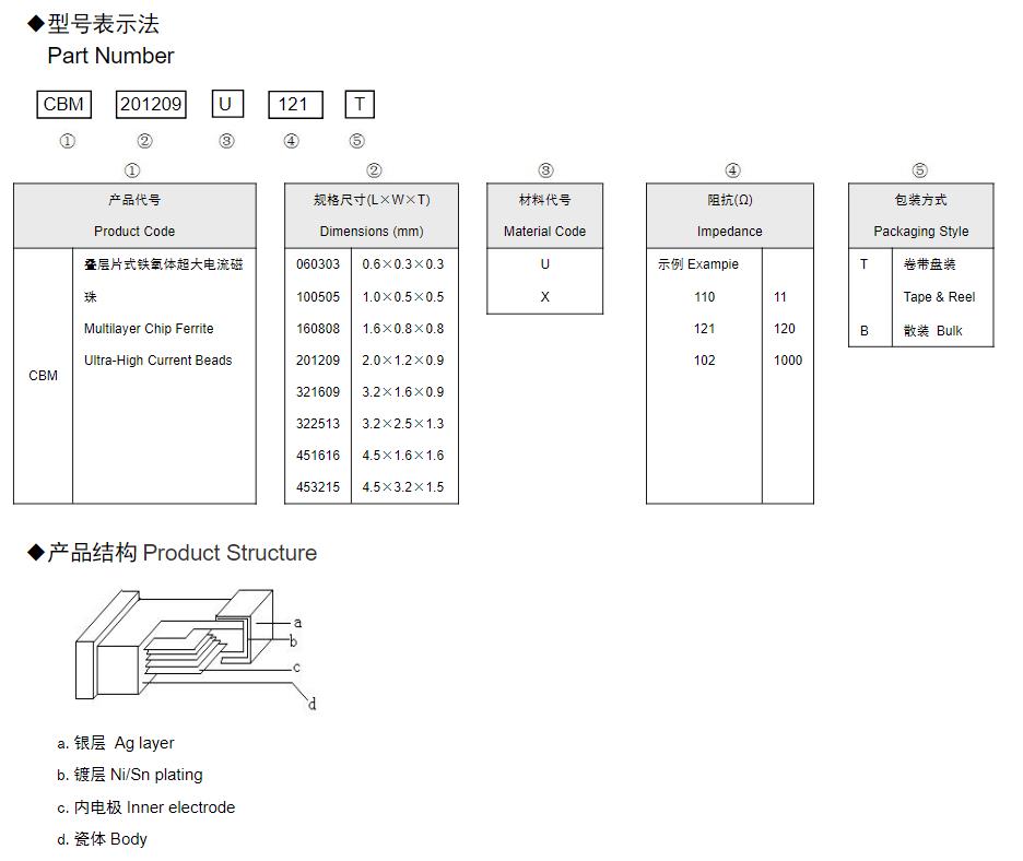 风华高科叠层片式铁氧体超大电流磁珠(CBM) 命名规则: