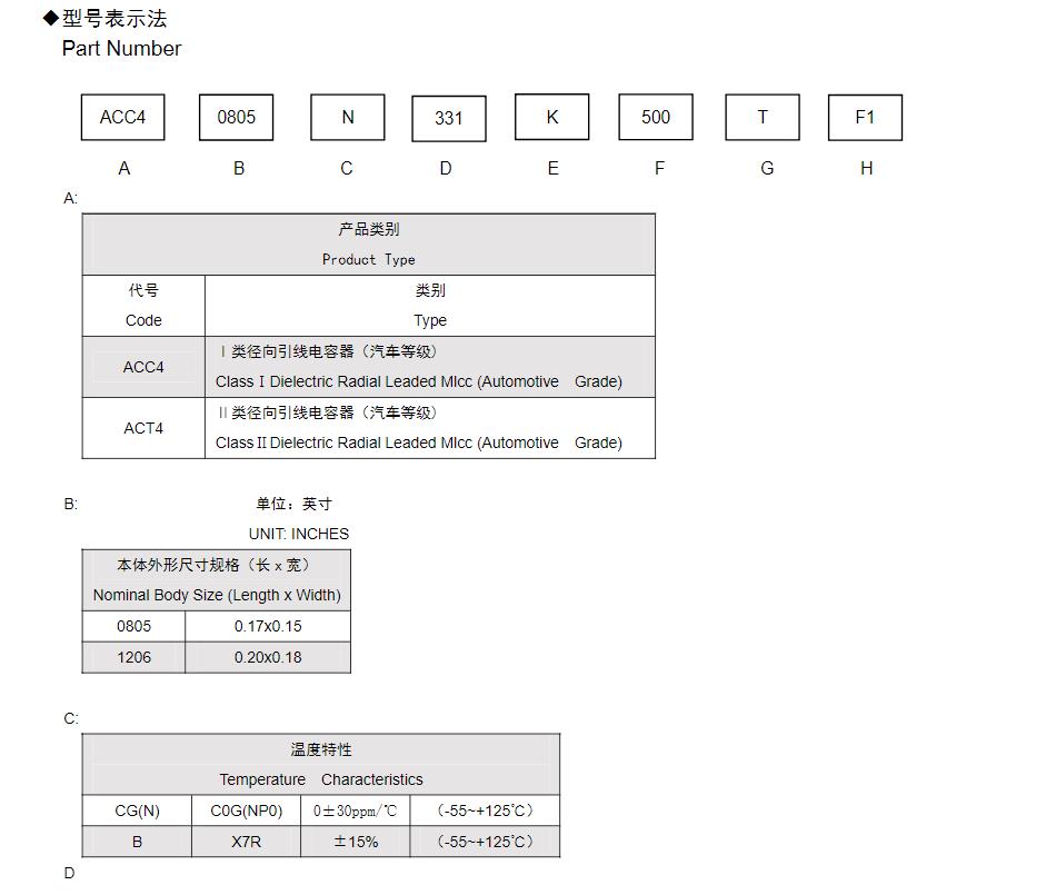 风华高科车规径向引线多层陶瓷电容器型号命名规则: