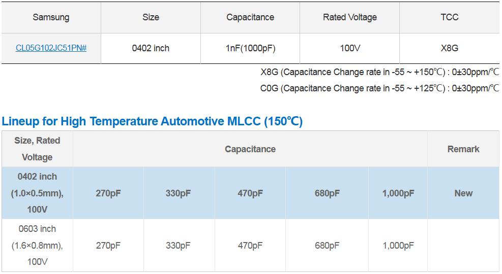 三星电机新品温度补偿用车载MLCC 150℃ 0402 1nF 100V