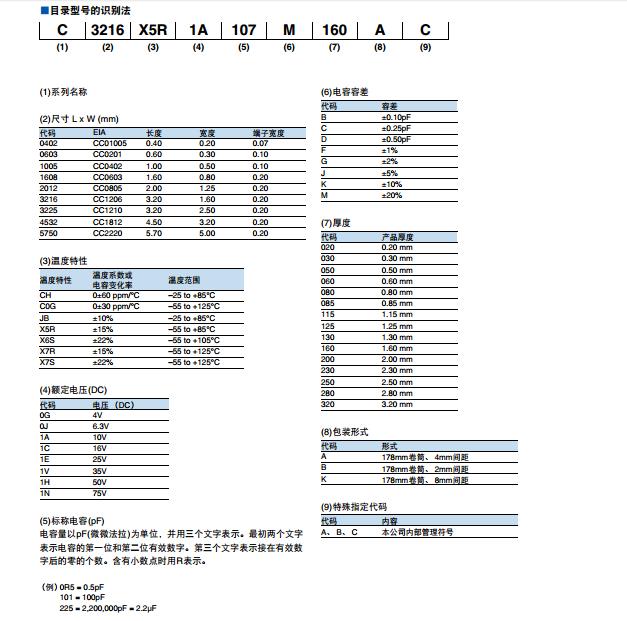 偏差:B=±0.1pF、C=±0.25pF、D=±0.5pF、F=±1%、G=±2%、J=±5%、K=±10%、M=±20%、Z=-20%+80%