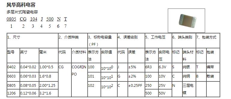 【CG】 2、介质种类:介质种类。由贴片电容介质及特性介绍我们贴片电容的所谓介质实际上是该电容的代表着工作温度。介质不同工作温度不同。风华通用型贴片电容介质有5种,分别用CG(c0g或NPO)、B(X7R)、F(Y5V)、X(X5R)、E(Z5U)表示。