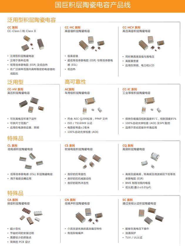 国巨的积层陶瓷电容为电路设计人员提供出色的性能、可靠性和成本优势。国巨提供多种类型的积层陶瓷电容(MLCC),包括一般品,高容,高压,软端和高频。其中,高容MLCC是电容方面的高端产品,顺应电子行业朝向融合,多功能和小型化的趋势。
