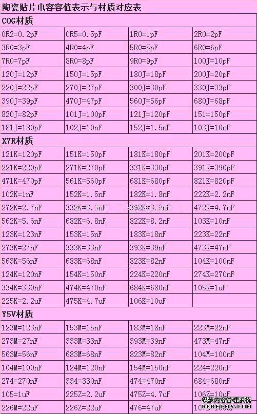 陶瓷贴片电容容值对照表