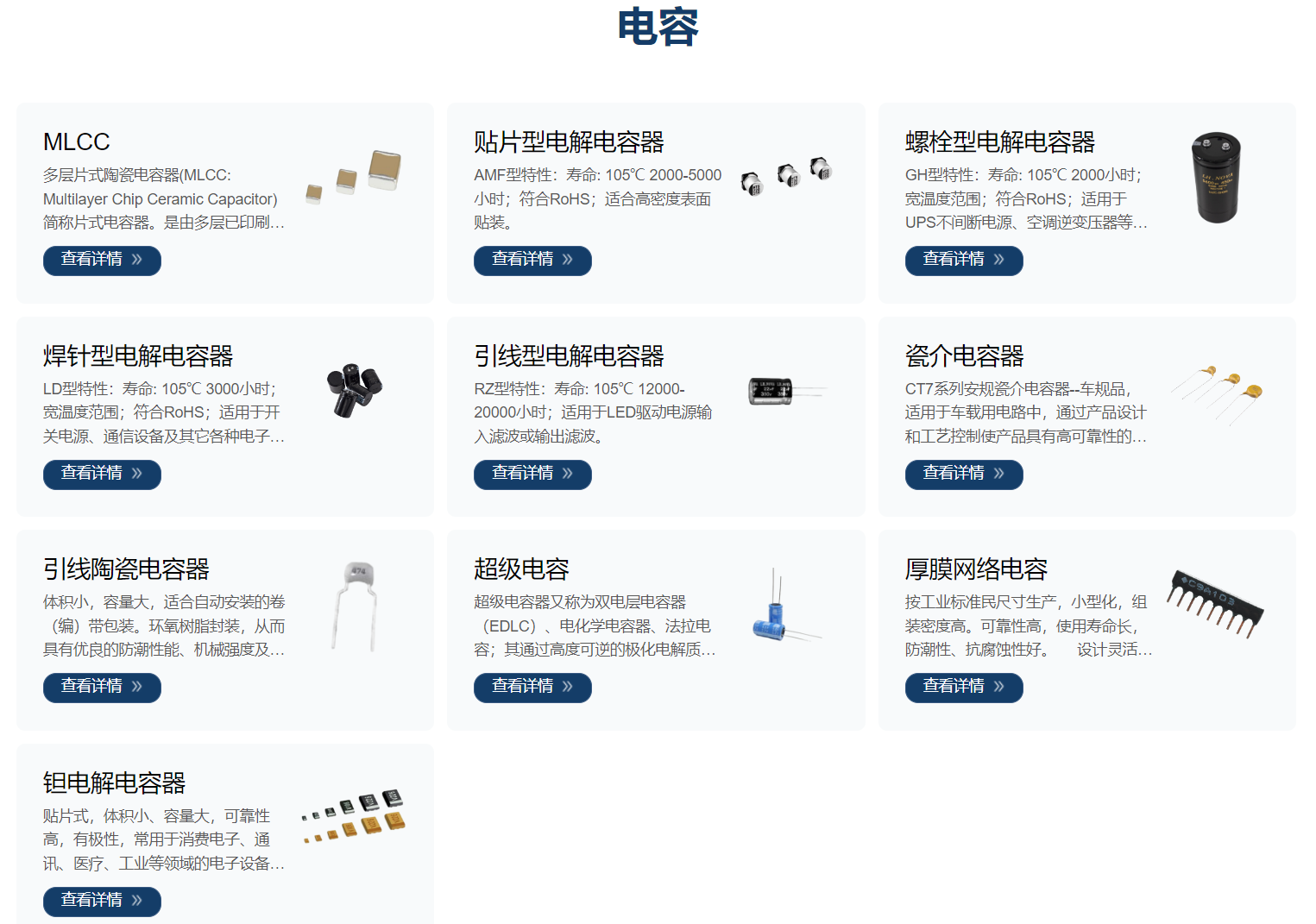 风华电容种类有:多层片式陶瓷电容、贴片型电解电容器、引线型电解电容器、超级电容、瓷介电容器、引线陶瓷电容器、螺栓型电解电容器、焊针型电解电容器、厚膜网络电容、钽电解电容器等产品。