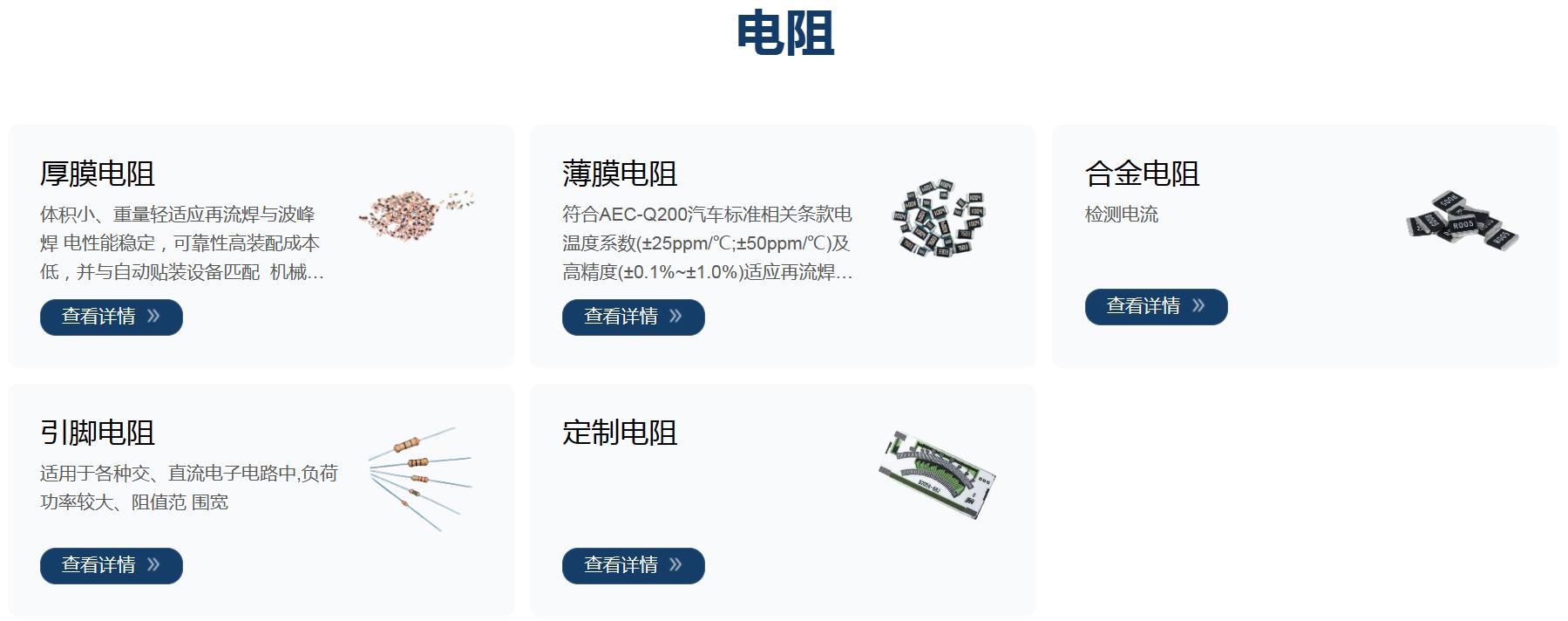 风华电阻种类有:厚膜电阻、薄膜电阻、定制电阻、热敏电阻、压敏电阻、合金电阻、色环电阻、厚膜网络电阻及其他产品。