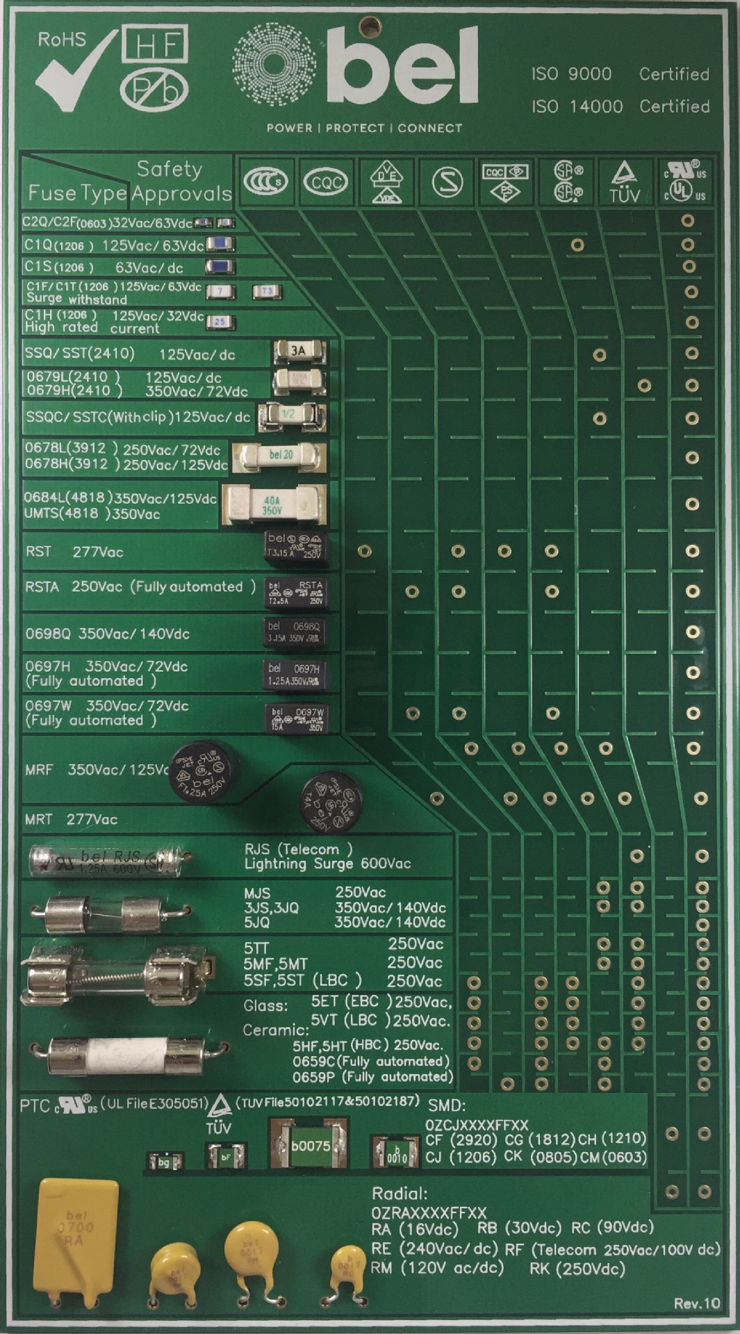 Bel Fuse-Circuit Protection 提供广泛的 PCB 安装、表面贴装和 PTC 自恢复保险丝。PCB 安装产品包括径向、标准玻璃和陶瓷管状保险丝。该公司已经走在行业向表面贴装保险丝设计(诸如砖式和片式保险丝)转型升级的前沿,解决了人们对小而紧凑的技术的需求。Bel Fuse-Circuit Protection 还提供完整的 PTC 自恢复保险丝产品线,同时具有表面贴装和径向封装选择。这些保险丝产品有许多第三方机构按照各种各样的性能标准进行了认证。认证标志授权机构如 UL、CSA、PSE、CCC、VDE 和 Semko。这些保险丝和 PTC 自恢复产品全部符合 RoHS 2 规范