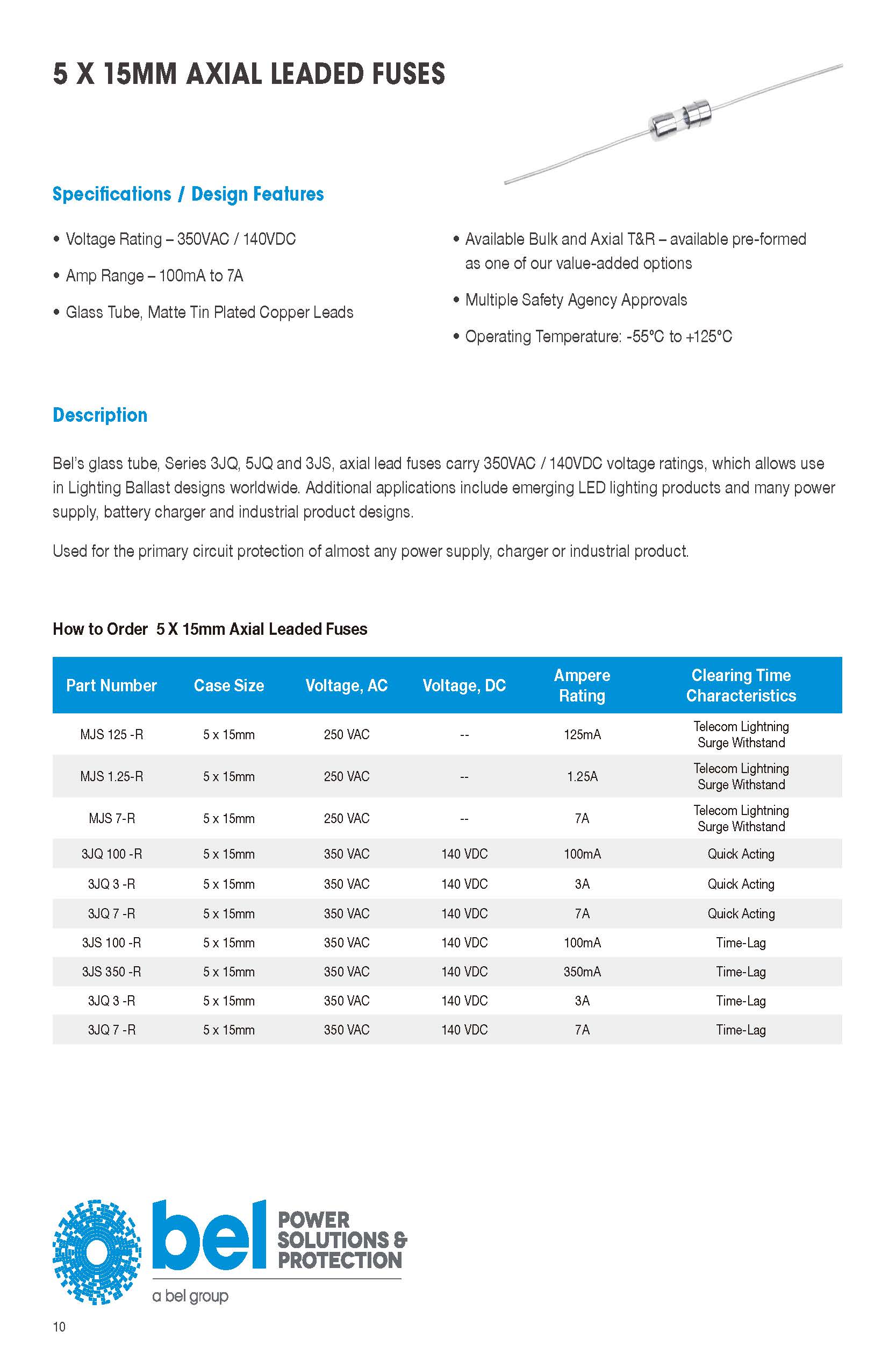 Bel的玻璃管,3JQ,5JQ和3JS,轴向熔断器携带350VAC / 140VDC电压额定值,允许使用