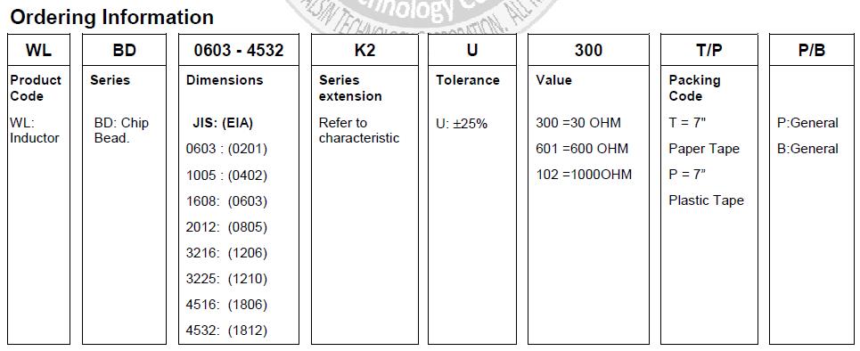 华科贴片磁珠命名规则:例如:WLBD0603-4532K2U300T/PPB