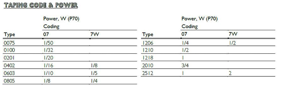 产品功率:1/50W;1/32W;1/20W;1/16W;1/10W;1/8W;1/5W;1/4W;1/2W;3/4W;1W;3W