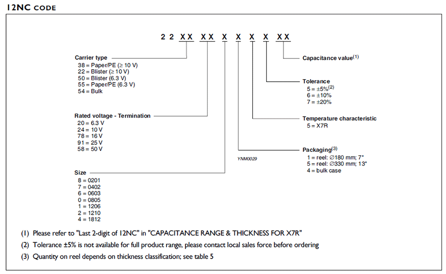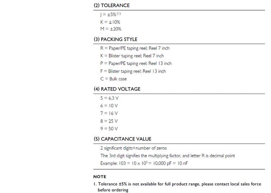 电容公差:J = ±5%、±10%(K)、±20%(M)