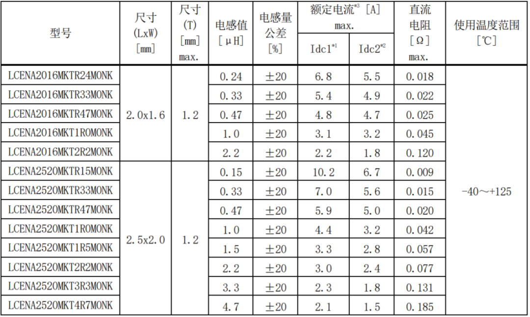 *1 额定电流(Idc1)是负载直流电流时的电感变化率在 30%以内的电流值(at 20℃)