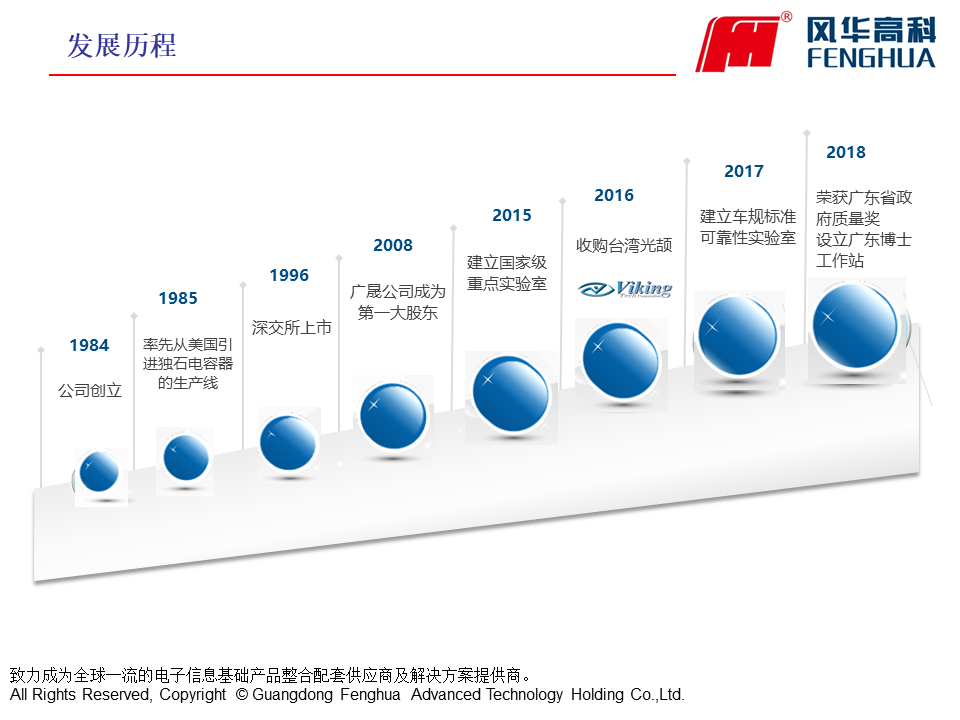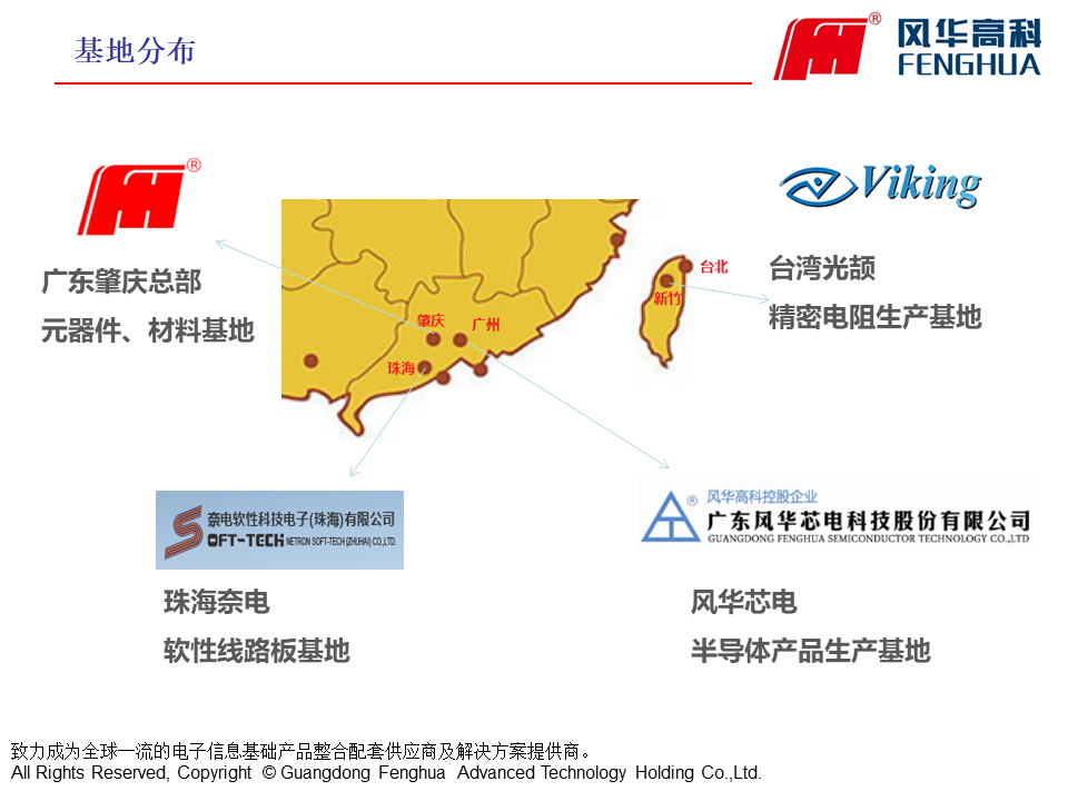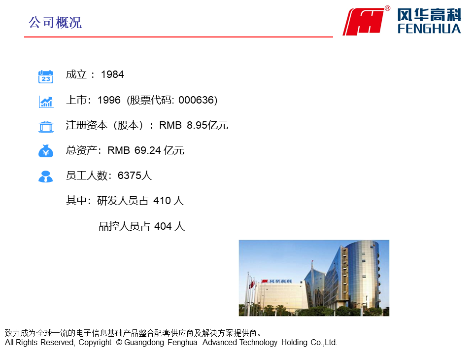 广东风华高新科技股份有限公司(证券简称风华高科,证券代码000636)成立于1984年,是一家专业从事高端新型元器件、电子材料、电子专用设备等电子信息基础产品的高新技术企业,1996年在深圳证券交易所挂牌上市。风华高科自进入电子元器件行业以来,实现了跨越式的发展,现已成为国内最大的新型元器件及电子信息基础产品科研、生产和出口基地,拥有自主知识产权及核心产品关键技术的国际知名新型电子元器件行业大公司。