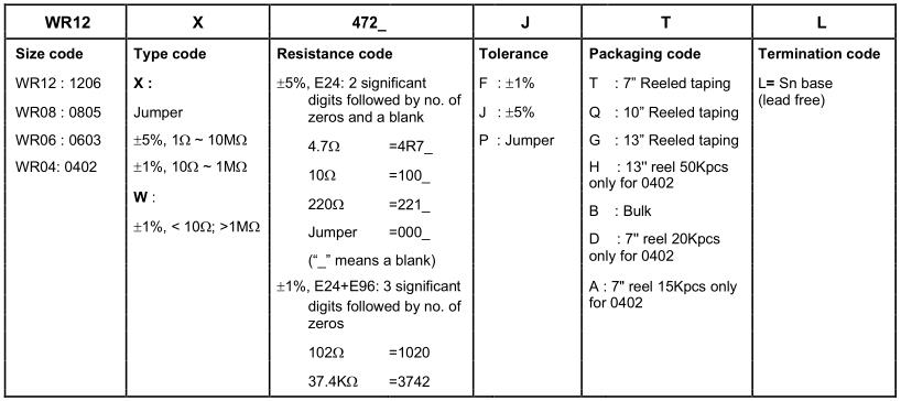 华新科贴片电阻命名规则对照表:例如:华新科电阻型号:WR12 X 472_ J T L尺码WR12 : 1206 WR08 : 0805WR06 : 0603WR04:0402类型代码X :跳线5%, 1 ~ 10M 1%, 10 ~ 1M :