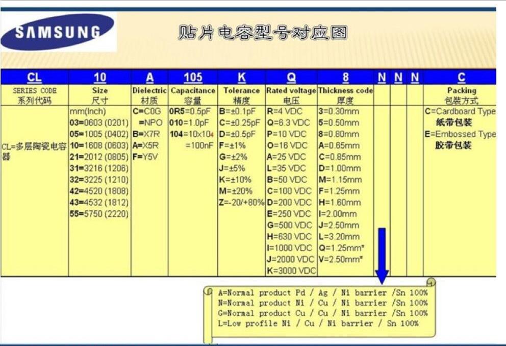 三星贴片电容规格对照表,对于很多新采购也需要一份三星电容对照表,三星品牌属于电子元件知名品牌之一,超翔电子专业代理三星贴片电容,型号规格齐全,欢迎咨询,下面是三星贴片电容规格对照表,希望对您有所帮助?1 系列编码: CL=积层陶瓷电容2 尺寸编码03=0201(0603) 21=0805(2012) 42=1808(4520)05=0402(1005) 31=1206(321