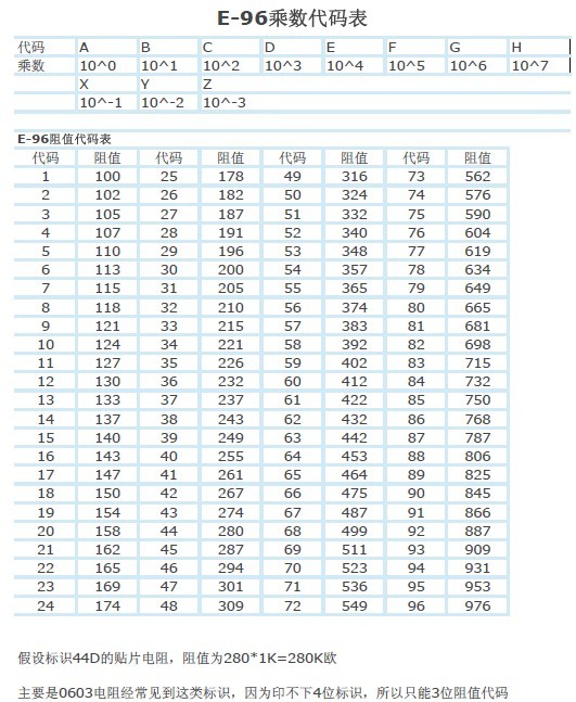 贴片电阻阻值对照表
