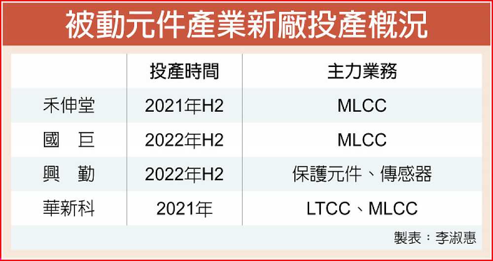 被动元件厂 砸250亿扩产,为了迎接5G、车用的需求,2021~2022年间至少有四座被动元件新厂投入量产,其中禾伸堂(3026)2021年下半年龙潭新厂可望率先试投,由于电动车需求将在2025年进入主升段,红色供应链没有合格的产能之下,台、日被动元件厂将成受惠者。 合计国巨(2327)、禾伸堂、兴勤(2428)、华新科(2492)等四家厂商,投入新厂的资金超过250亿元,光
