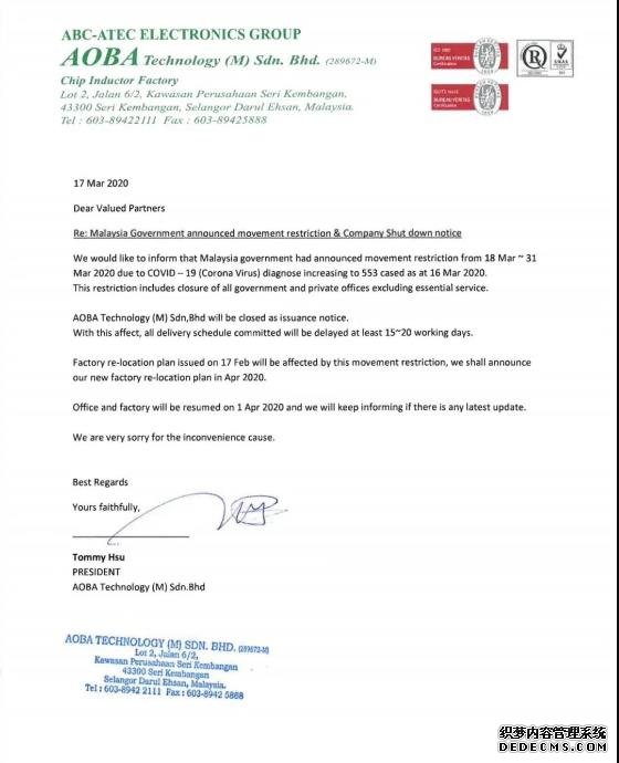 疫情影响!马来西亚停工14天,电感、电阻再受影